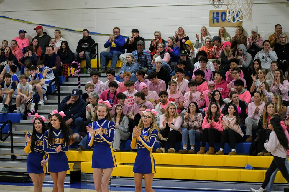 Basketball games were well attended last winter thanks in part to the return of the Mountaineer cheerleaders. The squad performed halftime shows and coordinated themes for the audience, such as Hawaiian night.