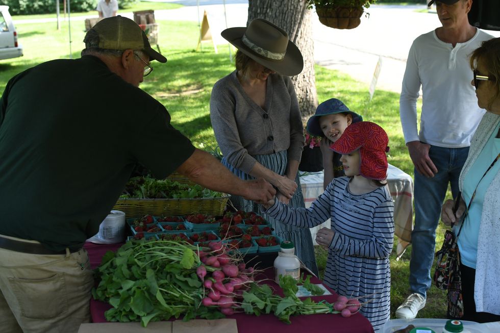 Gordon Ridgway, first selectman of Cornwall and owner of Ridgway Farm, handed out strawberry samples to the Hall family. The Halls moved to Sharon within the last year and were visiting the Cornwall Village farmer’s market for the first time.