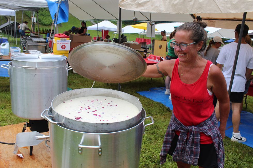Sara Jack kept an eye on the clam chowder simmering in a double-boiler at the Jane Lloyd Fund clambake. Photo by Patrick L. Sullivan