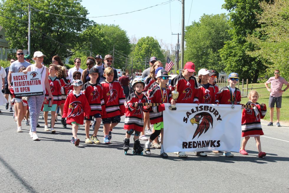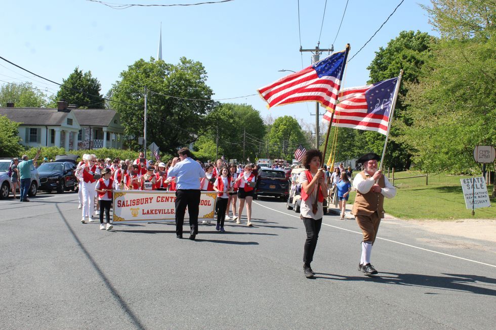 The parade included the Salisbury Band, Salisbury Central School band (as one unit), the Redhawks hockey team, the Rotary Club, the Lakeville Hose Company, the Salisbury Volunteer Ambulance Service, and Salisbury’s veterans, most in uniform.