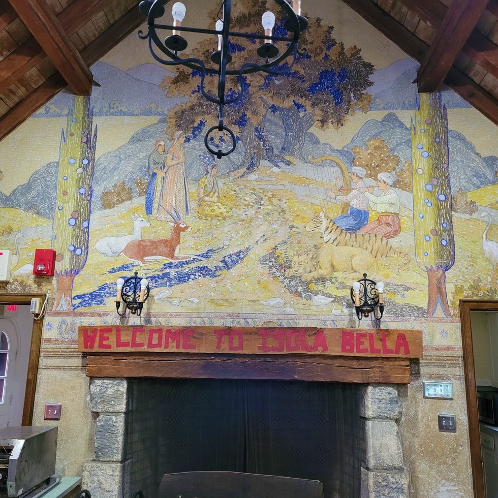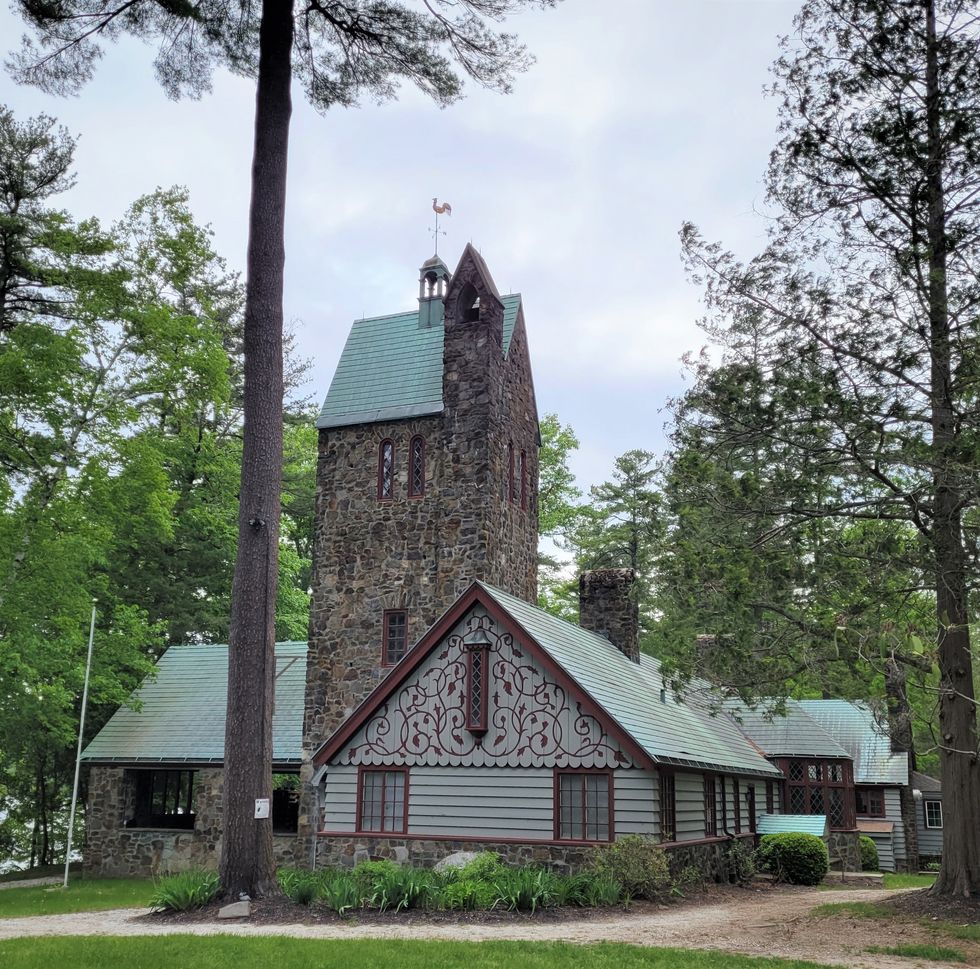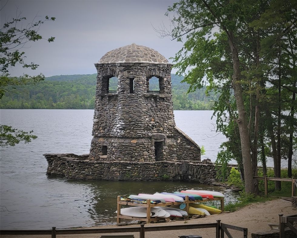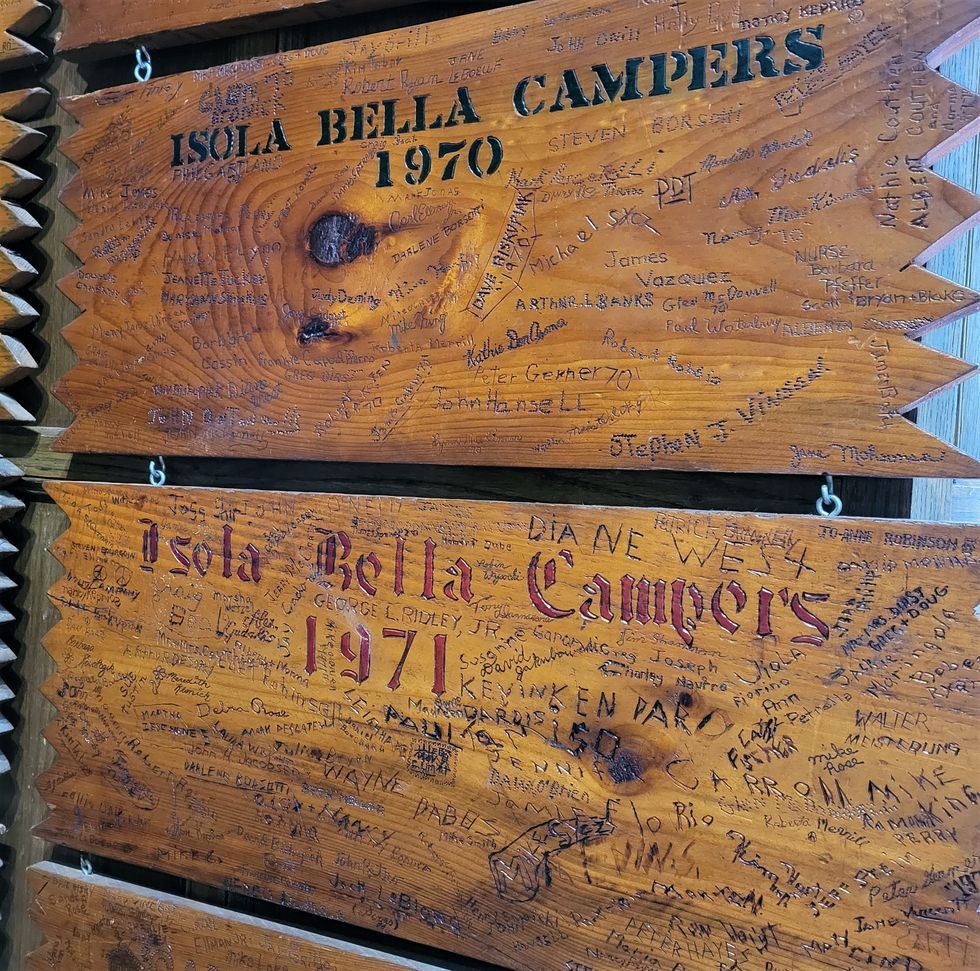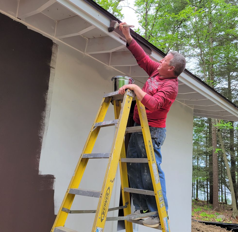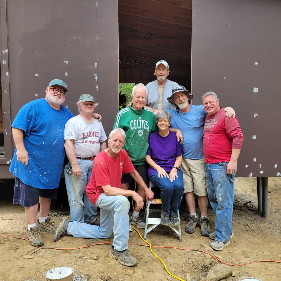 Jeff Bravin, executive director of the American School for the Deaf, far right, posed with alumni of historic Camp Isola Bella on East Twin Lake in Salisbury on Thursday, May 26. The historic camp is undergoing a $700,000 expansion and renovation with alumni volunteering sunrise to sunset to get ready for campers on June 25.