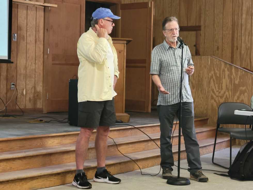 John Landon, at right, and Grant Bogle, at left, spoke to the Twin Lakes Association on Aug. 5 about the Salisbury Land Trust’s interest in a 297-acre parcel of land.