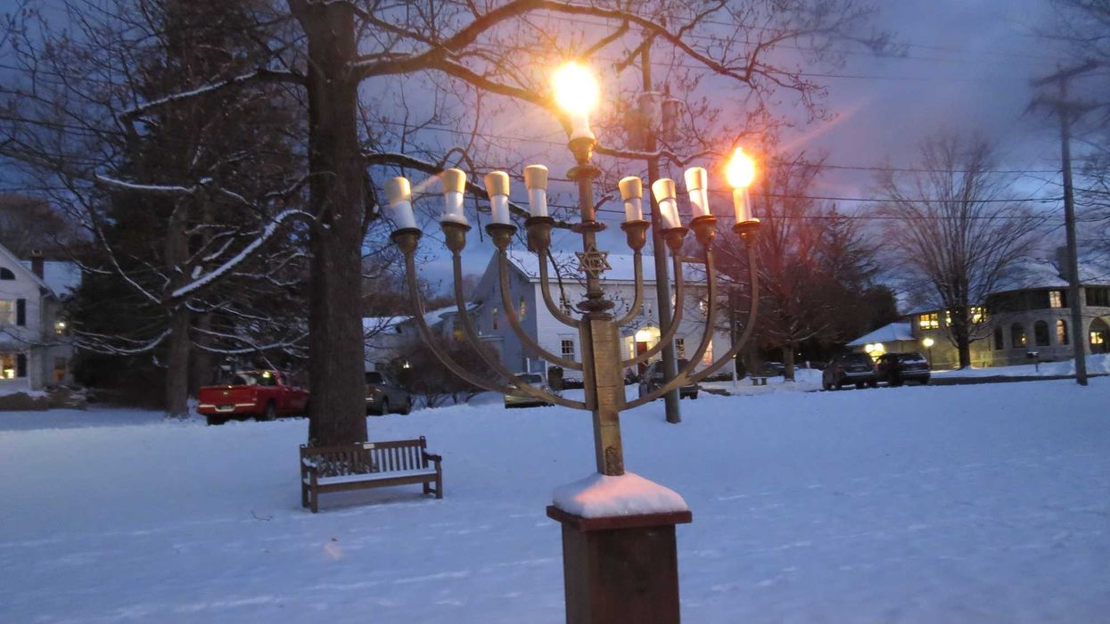 Carl Chaiet, who has been marking the Jewish holiday for several years, noted the candelabra used to observe the Festival of Lights, stands between the town’s Christmas tree and the creche, the latter sharing an electrical connection with it.