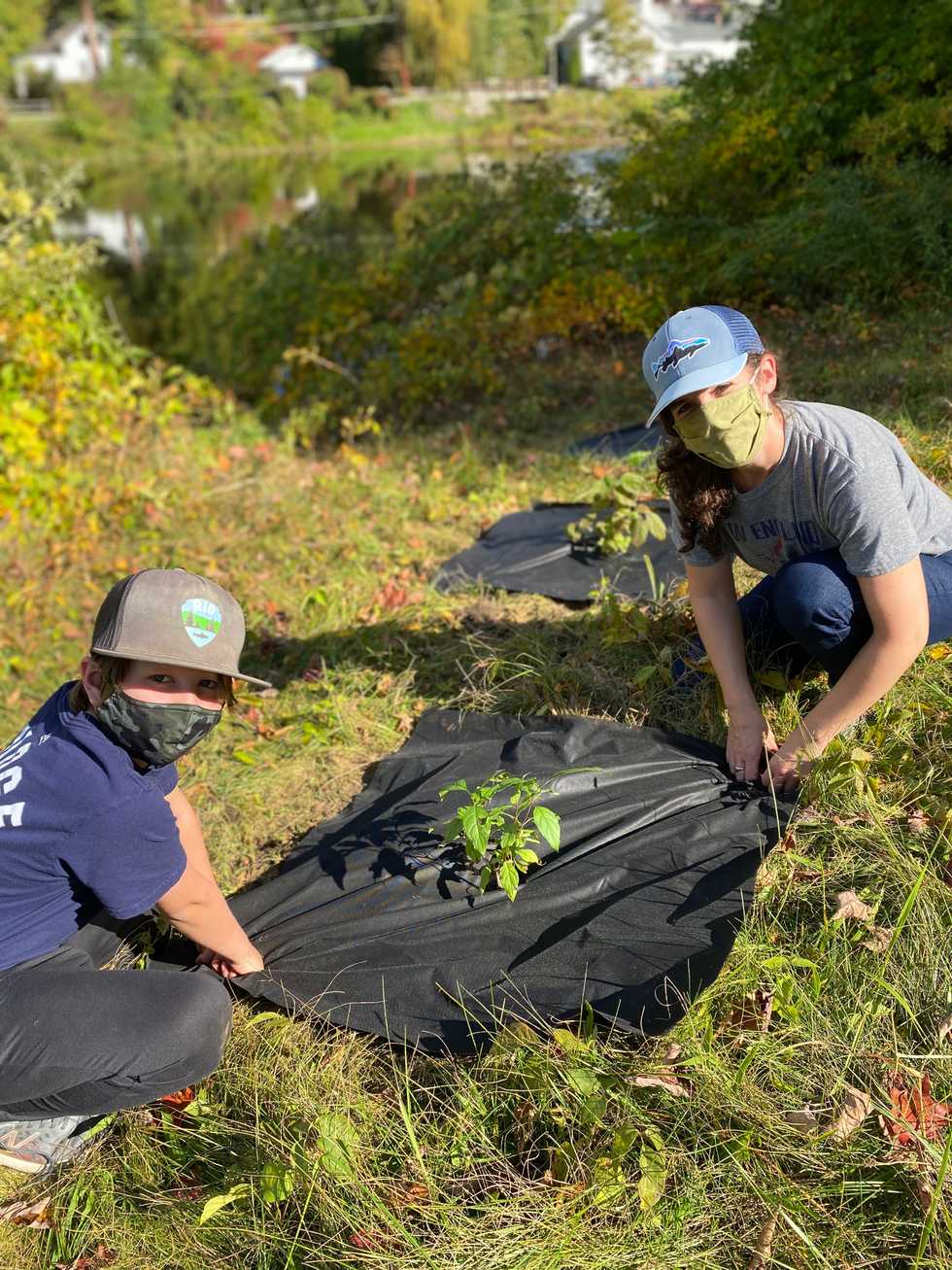 Putting the finishing touches on a riverside planting were River Jastremski, left, and Jeannie Curry of West Hartford, doing their part to reclaim a section of Housatonic riverbank from the ravages of invasive knotweed.