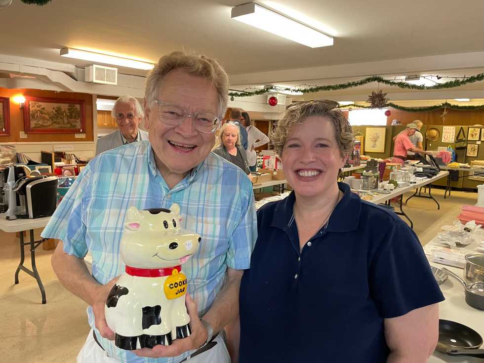 Meeting for the first time at the half-price Rummage Sale held on Saturday, August 5 at the United Methodist Church in Sharon were the Rev. Douglas Grandgeorge of The Smithfield Church in Amenia and the Rev. Dr. Anna Crews Camphouse, who recently began her ministry at the Methodist churches in Sharon and Lakeville. The whimsical cookie jar that moo-ed with every lift of the lid was just one of the items that drew their attention and found a buyer shortly thereafter.