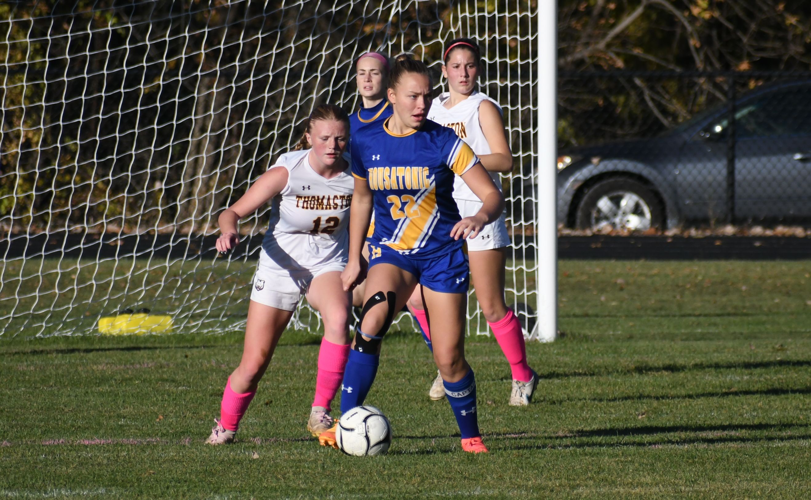 HVRHS striker Ava Segalla scored both goals for the Mountaineers who led 2-1 with 20 minutes remaining. Thomaston's fast-paced offense kicked into high gear late in the game and scored twice to secure the win.