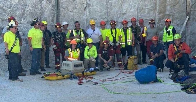 Northwest Regional Rope Rescue Team rappelled into the quarry at Mineral Technologies to rescue Rippy.