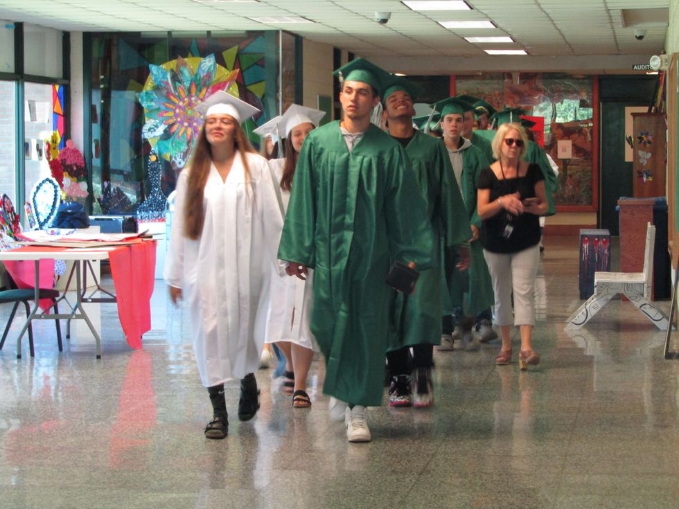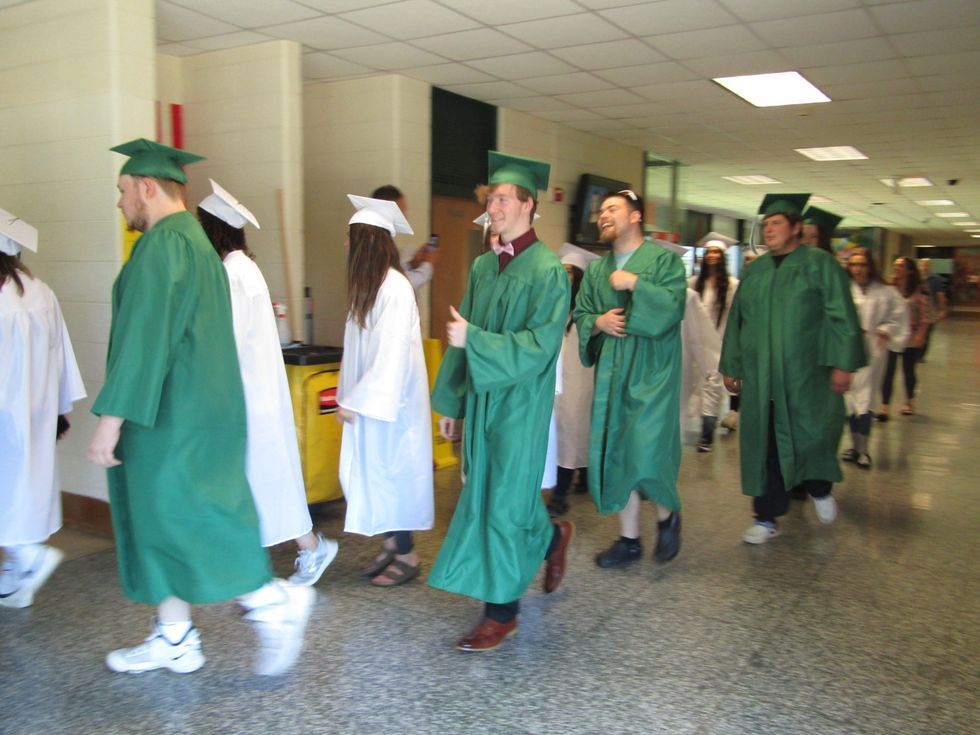Dressed in green and white, the graduates began marching in two straight lines at 2 p.m. through the high school hallways and made their way through Eugene Brooks Intermediate School before crossing the street to Webutuck Elementary School.